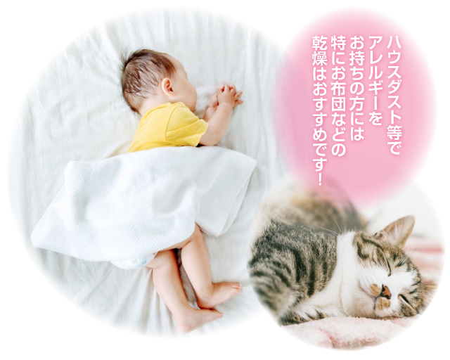 お布団の中のホコリ・花粉・ダニなどを乾燥機が吸い取り分解してくれるので、かなり取り除くことが